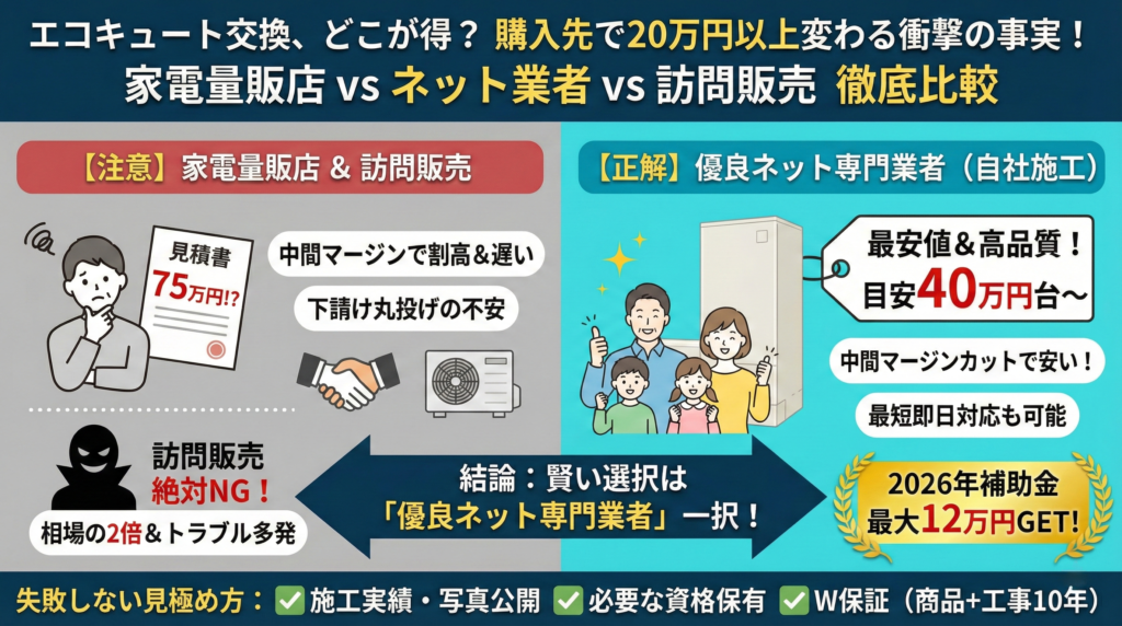エコキュート交換はどこに頼む?家電量販店 vs ネット専門業者|価格・保証・スピードを徹底比較